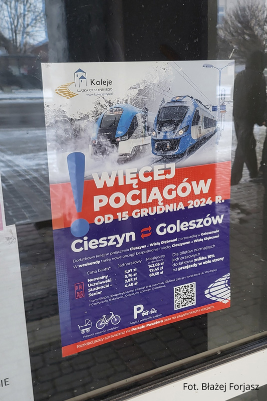 P.S. Od 14 grudnia 2025 roku przewidywany jest dalszy wzrost ilości pociągów pasażerskich na szlaku Goleszów – Cieszyn do 12 par pociągów w dni robocze (24 pociągi w obie strony) oraz 13 par pociągów w weekendy (26 pociągów w obie strony), zostanie także uruchomionych więcej bezpośrednich pociągów między Cieszynem a Wisłą Głębcami.