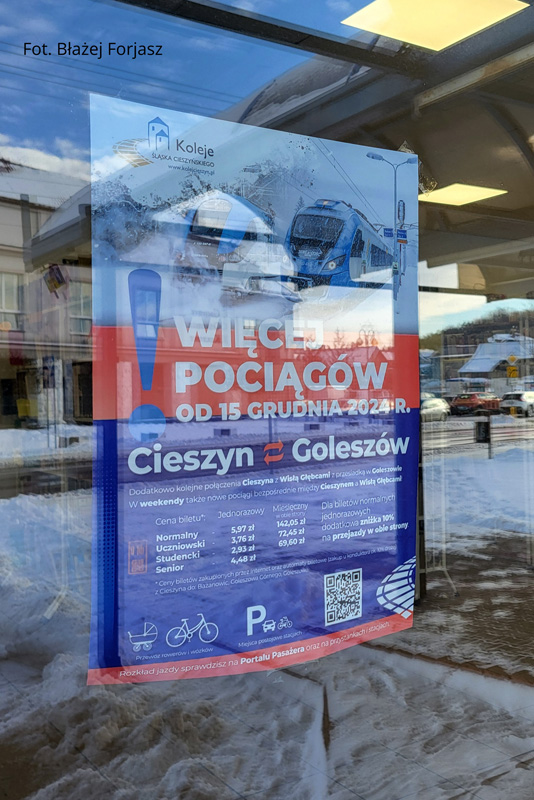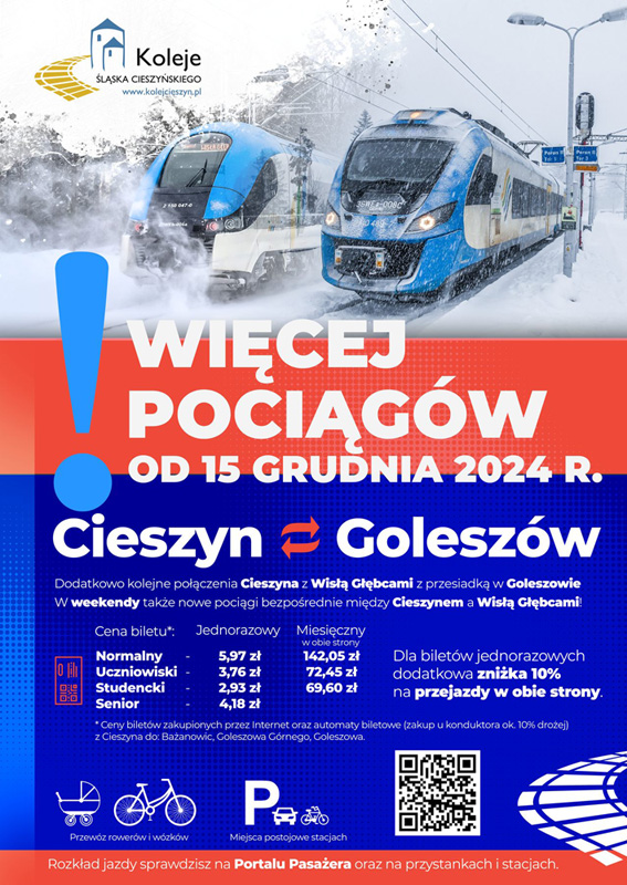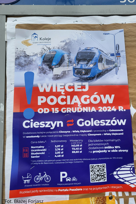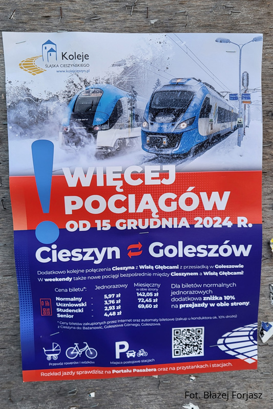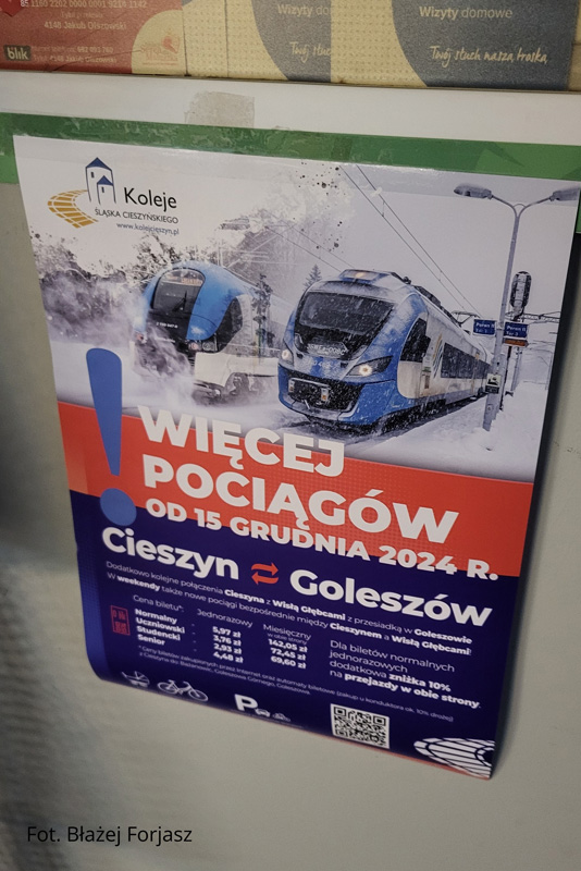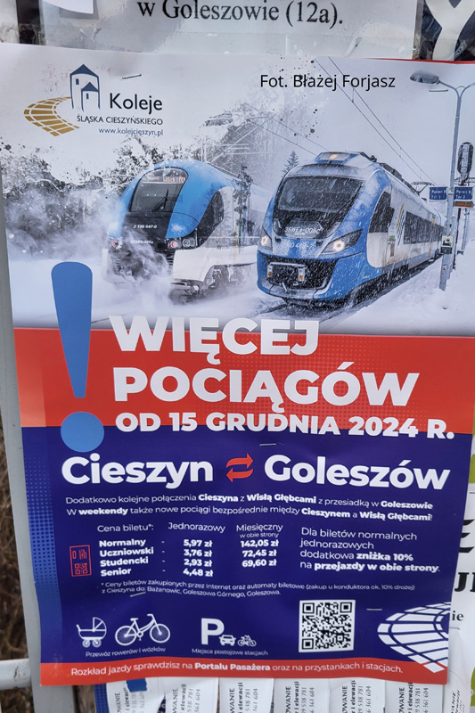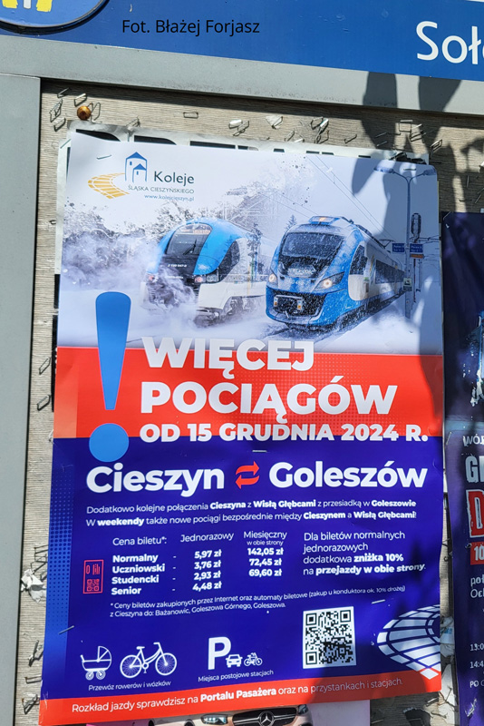 W związku z kolejnym zwiększeniem oferty przewozowej na szlaku Goleszów – Cieszyn od dnia 14 grudnia 2024 roku przeprowadziliśmy kolejną kampanię promocyjną dotyczącą reklamy połączeń kolejowych w naszym regionie. Tradycyjnie projekt plakatu na podstawie naszych fotografii opracowała firma Spiderdesign, natomiast wydruk został przygotowany przez agencję Colet.